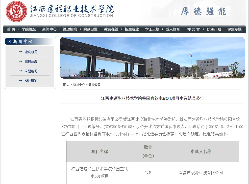 近日,由江西省鼎躍招標(biāo)咨詢有限公司受江西建設(shè)職業(yè)技術(shù)學(xué)院委托組織公開比選,江西建設(shè)職業(yè)技術(shù)學(xué)院校園直飲水BOT項(xiàng)目,南昌俊源科技有限公司憑借過硬的產(chǎn)品質(zhì)量、豐富的校園直飲水工程項(xiàng)目經(jīng)驗(yàn)和完善的售后服務(wù)體系,贏得評委的一致認(rèn)可,在眾多品牌中脫穎而出,中標(biāo)成功!